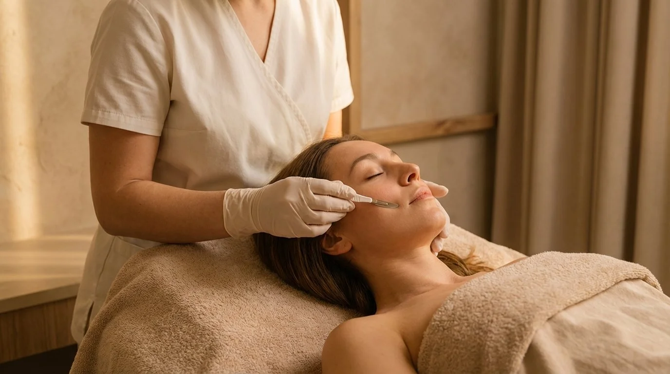 / this exfoliation method uses a sterile surgical blade to gently remove dead skin cells and peach fuzz. It enhances product absorption, makeup application, and gives you an instantly smoother, more luminous face.
